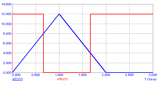 ed ecco il cambiamento di stato dell'uscita (OUT, traccia rossa) al variare delle tensione applicata ai 2 pin precedentemente indicati (V3, traccia blu):