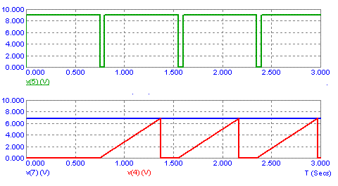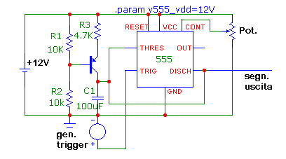 All'arrivo di un impulso di trigger (impulso di "zero") la rampa inizia e cresce fino al raggiungimento di una soglia stabilita col potenziometro (Pot), dopodiché viene forzata a zero dall'uscita Discharge del 555.