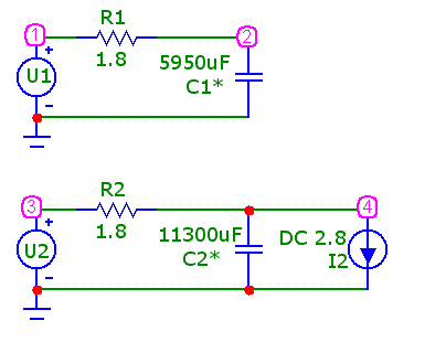 In particolare, dato l'andamento a gradino di U (tensioni rispettivamente v(1) e v(3)), si fanno tracciare, (con Analysis/Transient/Run), i valori di v(2) e v(4) che rappresentano le forze controelettromotrici (e) nei 2 casi.
