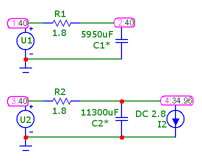 Come si vede, nel primo caso (v(2), motore a vuoto) la e raggiunge la tensione U dopo un transistorio esponenziale, mentre nel secondo caso (v(4), motore sotto carico) la e raggiunge un valore stabile minore di U.