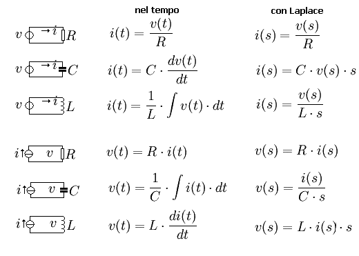Poiché lo scopo preminente è qui la soluzione relativa ai circuiti elettrici, si ritiene utile riportare un prontuario delle relazioni che governano tensione e corrente istantanee nei principali elementi circuitali (resistenze, capacità ed induttanze).