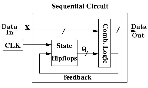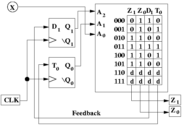 In sintesi, le variabili di ingresso X vengono legate ai segnali Q provenienti da un set di Flip-Flop (che rappresentano i vari stati del sistema) per ottenere una "decodifica" in uscita. La parte centrale della FSM e' costituita dalle relazioni fra "ingressi" ed "uscite" rappresentabili con una tabella di corrispondenza: