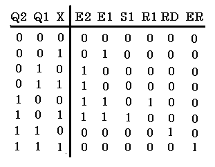 Come si vede la tabella fa corrispondere le combinazioni degli ingressi (indirizzo di riga) con lo stato delle uscite, ma anche con le abilitazioni dei singoli Flip-Flop, il che significa che è possibile pilotare quella che ad ogni passo (cioè dopo l'arrivo del fronte d'onda del clock) sarà l'uscita Q di ogni FF.