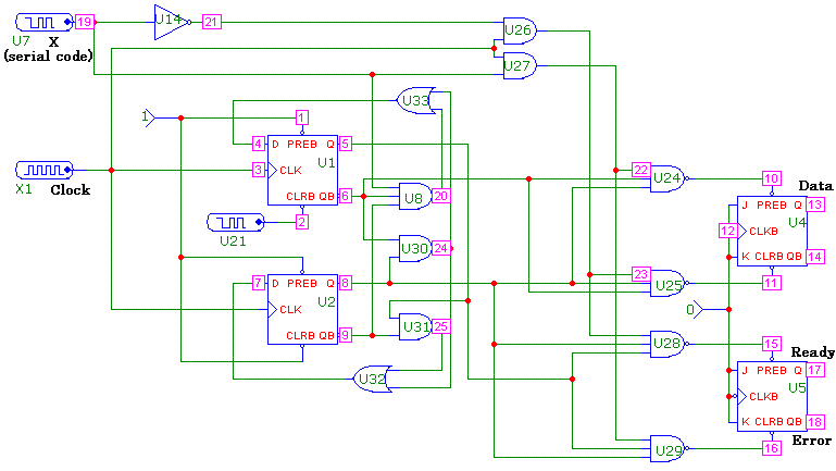 Nello schema precedente compare sia un generatore di Clock (X1), sia uno "stimolatore" (U7), in grado di riprodurre l'andamento del codice d'ingresso X desiderato.