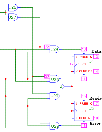 Si riconoscono immediatamente i D-FF U1 ed U2, le sui uscite determinano i segnali Q1 eQ2 della tabella, mentre i JK-FF U4 ed U5 servono alla memorizzazione delle uscite. La rete di elementi logici immediatamente alla destra di U1 ed U2 è l'implementazione della tabella di Q1 e Q2, mentre quella a sinistra dei FF di uscita è ovviamente riferita alla tabella di Set-Reset rispettivamente del dato e del consenso.