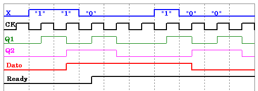 Dall'alto in basso si vedono: i codici ricevuti (X), il Clock, lo stato dei FF (Q1 e Q2) ed infine l'attivazione del comando (Dato, prima ON e poi OFF) e del consenso (Ready)