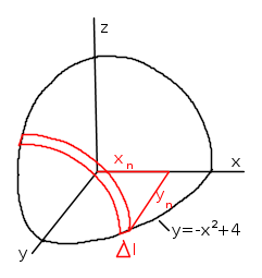 La figura mostra un quarto di elissoide ed illustra l'applicazione delle differenze finite: si genera la serie di xn fra i limiti, si calcola il corrispondente yn, quindi il Δln e lo si moltiplica per il percorso di rotazione di questo (cioè