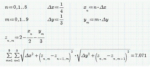 In definitiva , il metodo delle differenze finite, richiede la suddivisone dei limiti in incrementi (N in x,M in y), il calcolo degli zn,m valori della funzione, il calcolo dell'area di ciascun "rettangolino" della superficie, ed infine la somma di queste aree.