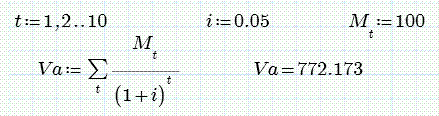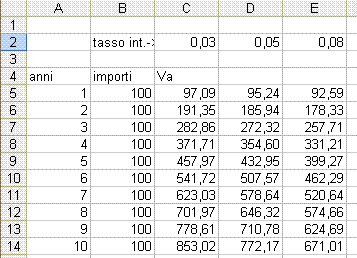 Con un tasso di interesse del 5% i 100 Euro ricavati dopo il primo anno, valgono "oggi" poco più di 95, quelli del secondo anno, ancor meno... Sommando questi valori si ottiene quanto vale attualmente l'investimento che dà tali rendimenti, valore che diminuisce notevolmente al crescere del tasso d'interesse