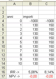 Quest'ultimo l'abbiamo già visto nell'attualizzazione (la funzione VAN di Excel) ed anche il primo ha una funzione equivalente in Excel, denominata TIR.COST). Eccone l'uso: