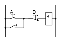 La chiusura del pulsante A alimenta la bobina del relè R che si automantiene sul proprio contatto R. Per far rilasciare il relè occorre agire sul pulsante (normalmente chiuso) B.