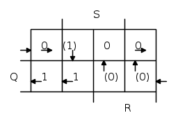 Si è detto che non è possibile utilizzare per questi circuiti la mappa di Karnaugh, ed infatti è evidente che ad esempio con S ed R entrambi a "0", Q può essere "0" oppure "1" a seconda di ciò che e successo prima!