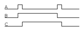 Vi è quindi un segnale d'ingresso (A) ed uno di uscita (B), ma si vede che è necessaria una terza condizione (C), per "memorizzare" il primo impulso. Ecco il relativo grafico nel tempo;
