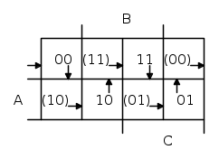 In ogni casella è riportato lo stato delle uscite B,C, racchiudendo tra parentesi, come già detto, gli stati instabili che forzano il passaggio alla casella successiva.