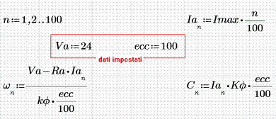 Impostando i valori "attuali" di tensione applicata Va (in questo caso uguale alla nominale) e di eccitazione ecc (in % rispetto alla massima), si può far variare la corrente da 0 a Imax in 100 valori (indice n), per calcolare altrettanti valori di velocità di rotazione e di coppia.