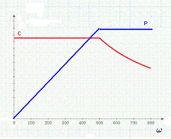 Un grafico sintetizza meglio quanto detto. Ecco come con la regolazione si può modificare la caratteristica del motore: coppia (in rosso) costante e potenza (in blu) crescente con la velocità nel primo tratto (fino alla <velocità nominale, qui di 500g/min), oltre tale velocità coppia decrescente iperbolicamente e potenza costante