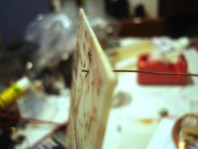 Inoltre sono presenti dei fori passanti nel circuito: per mettere in comunicazione le due facce ho utilizzato del filo di rame, che ho saldato da entrambe la parti come se fosse un reoforo di un componente.