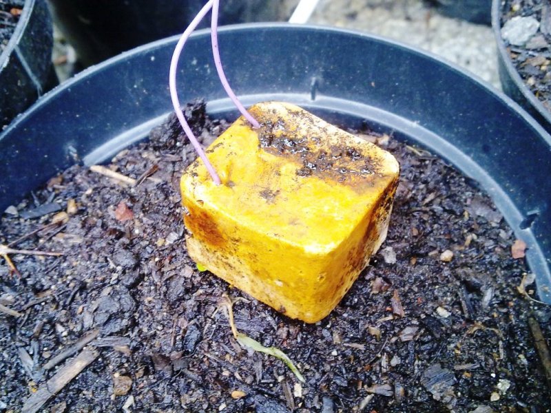 Infatti inizialmente come sensore di umidità usai dei semplici elettrodi infilati nella terra, ma riscontrai dei problemi: infatti con il passare del tempo la resistenza del terreno cambiava (sia nelle condizioni di secco sia in quelle di umido) svasando le misure e andando fuori scala. Informandomi mi sono reso conto che la resistenza del terreno cambia non solo in base alla quantità d’acqua contenute in esso, ma anche dalle sostanze nutritive e i sali minerali. Informandomi meglio, poi, ho letto che per ovviare questo problema, si doveva utilizzare del gesso al cui interno c’erano degli elettrodi. Il gesso è un materiale molto poroso ed è in grado di assorbire l’acqua abbastanza velocemente senza però far passare nessun altra sostanza. In pratica il blocchetto di gesso sotterrato in un vaso, assorbe la stessa quantità di umidità presente nel terreno. Anche il posizionamento è importante: il sensore va posto nella zona di terreno (o nel vaso) che tende a seccare per primo oppure in una zona che è una via di mezzo tra il secco e il bagnato (rispetto al resto del giardino o vasi). Ecco una foto del mio blocchetto (scusate ma è rimasto un anno sottoterra e a quanto pare gli elettrodi non erano proprio in acciaio inox come riportava la scatola)
