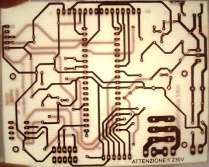 Ho realizzato un circuito stampato a doppia faccia per contenere la dimensioni non abbondanti all’interno della scatola. Per realizzarlo ho utilizzato la tecnica della fotoincisione e per allineare le due facce ho fatto in questo modo: prima ho esposto ai raggi UV una faccia della scheda. Finito con quella, ho passato con un pennellino la soluzione per lo sviluppo del positivo, solo negli angoli dove sono presenti i “cerchiolini” per il fissaggio dello stampato, in modo da metterli in risalto. Fatto ciò, ho fatto due piccoli forellini proprio al centro di questi cerchiolini in modo da avere un riferimento preciso anche sull’altra faccia: infatti basta allineare l’altro master in modo che i due fori siamo perfettamente centrati.