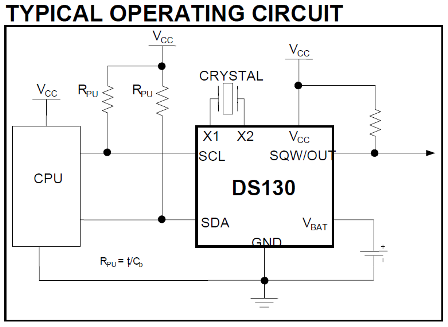 L’alimentazione è data da un piccolo trasformatore (va bene uno con un uscita 7-20Vac e da almeno 10VA) e un semplice LM7805 (che va alettato) che fornisce la tensione stabilizzata utile per il pic e tutto il resto. Il cuore del circuito è il stranoto PIC16F877 che controlla e gestisce tutta la centralina. E’ dotato di un quarzo da 16Mhz. L’ora viene generata e salvata dal modulo RTC che non è altro che un DS1307 con il suo quarzo e batteria montato su una schedina. Il modulo l’ho comprato su ebay, ma non è impossibile costruirselo da se. Riporto lo schema del modulo, presente anche sul datasheet dell’integrato: