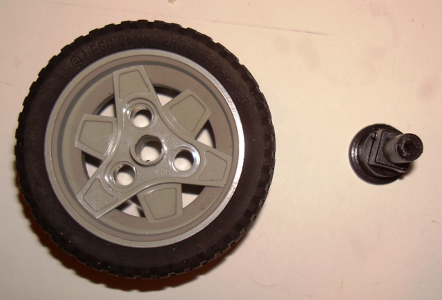 La parte più difficile è stata quella di adattare le ruote al perno del motore. Infatti esso aveva un perno strano (rotondo ma con dei lati tagliati parallelamente) e io dovevo farlo entrare nelle ruote prescelte, ovvero ruote del lego (sempre di mio fratello ) che hanno l'attacco a croce.