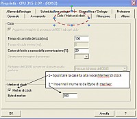 Così facendo si apre la finestra di configurazione dei parametri della Cpu. A questo punto bisogna selezionare la voce: "Ciclo/Merker di Clock", spuntare la casella, e inserire un valore che rappresenterà il Merker Byte di Clock che potremo utilizzare per le nostre applicazioni.Nell'esempio in figura è stato inserito il MB100.
