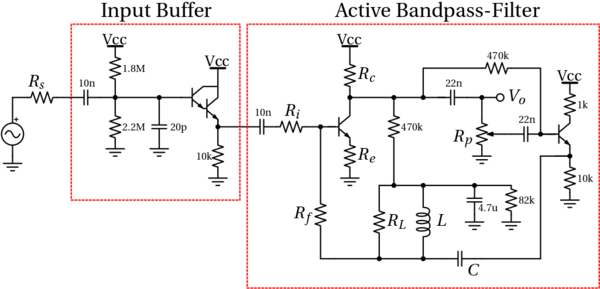 Il circuito del Wah è composto da uno stadio di buffering (Input Buffer) e uno stadio che funge da filtro attivo passa-banda variabile (Active Bandpass Filter), che rappresenta il vero cuore dell’effetto: tramite il potenziometro Rp è possibile variare la frequenza centrale del passa banda che ne determina il comportamento tipico. Lo schema elettrico completo è riportato in seguito: