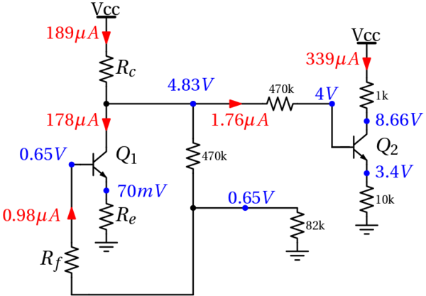 Proviamo ora a calcolare in maniera approssimata tutte le correnti e tensioni di polarizzazione. Supponendo entrambi i transistor Q1 e Q2 lavorino in regione attiva, si nota come la resistenza Re sia piccola se la associamo alle tipiche correnti di emettitore di un transistor (che supporremo di circa 1mA o meno), così come Rf lo è per le correnti di base (che supporremo di qualche decina di µA o meno); pertanto si può supporre che alla base di Q1 ci sia una tensione di circa 0.7V (tensione diretta della regione attiva base-emettitore), che viene riportata al terminale della resistenza da 82kΩ e produce una corrente di 0.7V/82kΩ=8.5µA la quale, supponendo scorra poi interamente verso la resistenza da 470kΩ, determina una tensione sul collettore di Q1 di 0.7V(1+470kΩ/82kΩ)=4.7V. Ne segue che la corrente su RC vale (9V-4.7V)/22kΩ=195µA, mentre quella sulla resistenza da 470kΩ vale (4.7V-0.7V)/(470kΩ+hfe2∙10kΩ)=1.76µA (dove si è supposto che hfe1=hfe2=180), la quale porta una tensione sulla resistenza da 10k di 1.76µA∙hfe2∙10kΩ=3.2V e una tensione sul collettore di Q2 di 9V-1kΩ∙1.76µA∙hfe2=8.7V.