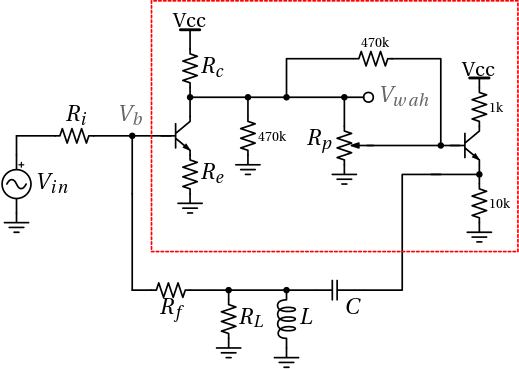 Dove si è supposto che tutte le capacità di disaccoppiamento abbiano un’impedenza trascurabile alle frequenze in banda di segnale. Le tensioni indicate torneranno utili nel corso della trattazione: si tratta della tensione di base del primo transistor Vb e della tensione di uscita del Wah Vwah.