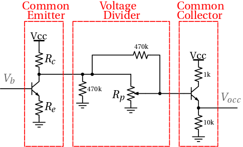 - un collettore comune che fa da buffer di tensione, aumentando la resistenza in ingresso e portando in uscita la tensione sul partitore con guadagno pressoché unitario: