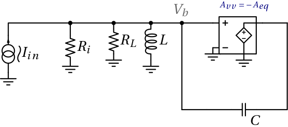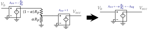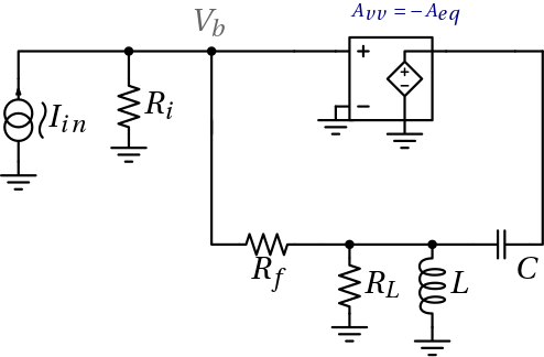 Si può pertanto sostituire con le dovute approssimazioni la cascata dei sopracitati blocchi con un unico blocco ideale amplificatore di tensione con guadagno Avv = − Aeq tale che: