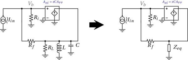 Per trovare una formula esatta per il calcolo della Zin con α≠0 occorre tirare in ballo buona parte di teoria dei circuiti retroazionati. Prima di fare ciò possiamo però operare delle semplificazioni per ottenere un circuito concettualmente più chiaro; prima di tutto trasformiamo la capacità in serie al generatore pilotato in qualcosa che faccia assomigliare di più la parte di circuito inferiore a una risonanza parallelo: applichiamo una trasformazione di Norton sul generatore dipendente con in serie l’impedenza capacitiva, ottenendo un generatore di corrente equivalente con una reattanza in parallelo.