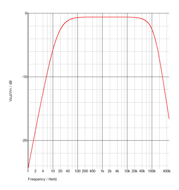 Per valutare le frequenze di taglio si può osservare che il circuito presenta un polo dovuto alla capacità di 20pF e uno zero dovuto alla capacità di 10nF (teoricamente ottimizzati per la banda audio). Si possono stimare tali pulsazioni di taglio che, con le opportune assunzioni (capacità non interagenti), valgono: