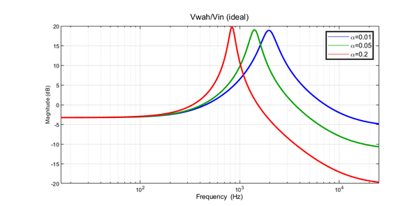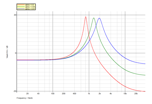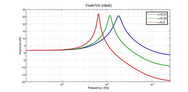 dove ω0 rappresenta la pulsazione di risonanza e ξ lo smorzamento. Nel caso di soluzioni complesse infatti la ω0 rappresenterà il modulo del polo/zero del numero complesso, mentre la ξ è legata alla sua fase; tradotto in termini pratici di risposta in frequenza la ω0 sarà la pulsazione centrale della campana, mentre ξ è legata al fattore di forma Q e dunque alla larghezza di banda della campana. Con questa approssimazione si nota come variando Aeq (e dunque α) si può aggiustare la frequenza di risonanza idealmente entro i due limiti (ottenuti ponendo α=0 e α=1):