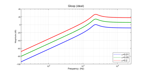 Analizziamo ora il denominatore: possiamo notare come esso sia identico al denominatore della funzione di trasferimento Zin,OL(s) calcolata sopra, pertanto i loro poli coincidono. Al variare di α la risposta in frequenza del Gloop assume la seguente forma: