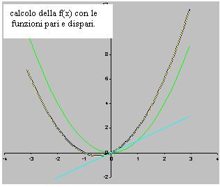 Nel grafico è stata riportata la f(x) = x2 + x che è stata decomposta nella funzione dispari y = x , e nella funzione pari resa dispari y = + / − x2, nonché le 3 curve calcolate coll metodo delle funzioni pari dispari che risultano perfettamente sovrapposte alle prime.