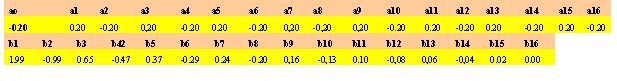 si ritrova una antisimmetria nei coeff. Ai, che rappresentano la parte dispari della funzione: Ai = − An − i ed una simmetria nei coeff. Bi, che rappresentano la parte pari della funzione: Bi = Bn − i. Si fa notare che, per il calcolo della serie di Fourier, i valori dei coeff. centrali: An / 2 e Bn / 2, in quanto non accoppiati, devono essere dimezzati : An / 2 = 0.5 * An / 2 e Bn / 2 = 0.5 * Bn / 2.