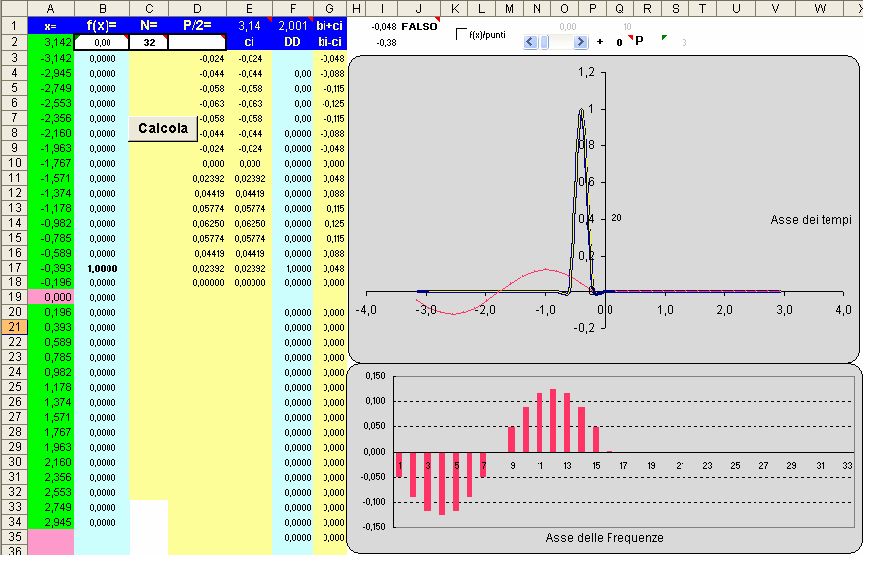 Nella figura sotto è stata considerata una funzione, definita in un periodo T [ − π; + π] e composta da 32 punti. Tutti i punti sono stati posti = 0 tranne il (2° punto da x=0) punto y(-0.393) = 1 . Per tale punto si ha una funzione delle frequenze con periodo T/2 e frequenza 2f .