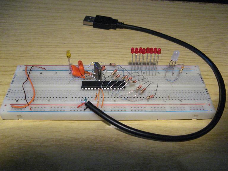 Ho collegato una serie di 8 led con relative resistenze da 220 ohm sulla PORTB e un led sulla PORTA che lampeggia quando la USB è riconosciuta da Windows.