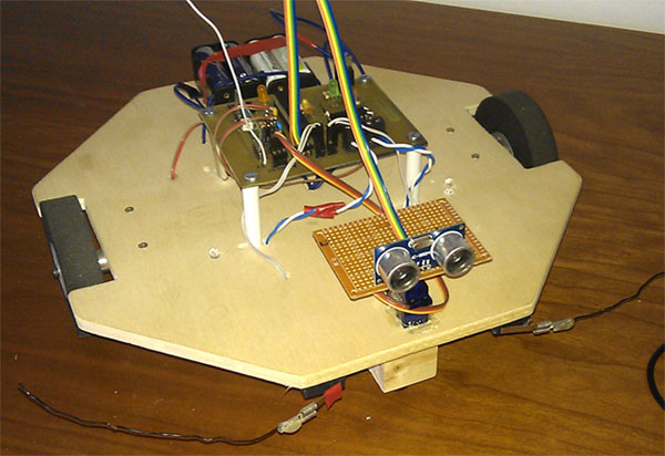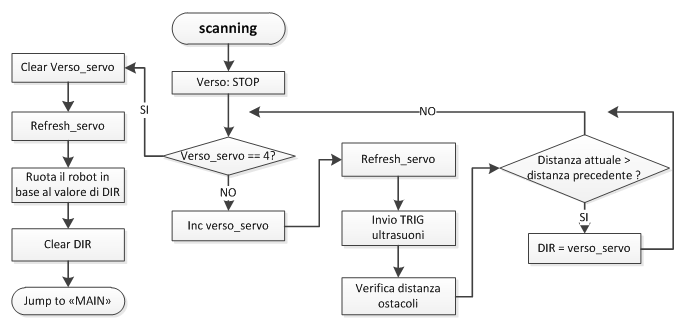 In posizione di riposo ( 0° - impulso di durata 1.5ms), il modulo ultrasuoni scansiona la direzione davanti al robot. In presenza di ostacoli, il robot si ferma ed il servo viene ruotato in maniera tale da scansionare le direzioni -90°, -45°, +45°, +90°. Individuata la direzione più libera, il robot ruota verso quella direzione e riprende poi il normale funzionamento.