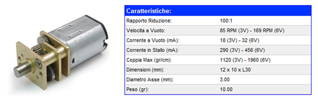 I motorini DC scelti sono i Sanyo Solarbotics che rispettano le specifiche imposte.Inoltre ingombrano pochissimo, sono leggerissimi, includono la riduzione meccanica e richiedono correnti e tensioni di lavoro inferiori rispetto ad altri modelli. Hanno anche un costo abbastanza contenuto.