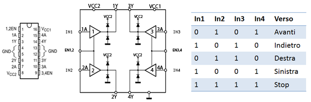 Da notare che vi sono poi due ingressi di alimentazione: uno a "bassa potenza" (VCC1 - pin16) per la gestione della logica, ed uno ad "alta potenza" (VCC2 - pin8) per prelevare l'energia da fornire ai motori.