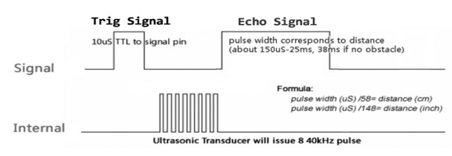 In pratica, forzando ad 1 logico per almeno 10μs il pin di TRIG del modulo, verrà trasmesso un segnale a 40Khz (in particolare vengono trasmessi solo 8 impulsi). Dopo l’emissione degli 8 impulsi, viene forzato ad 1 logico il pin ECHO (normalmente basso) del modulo: lo stato di questo pin ritorna basso solo quando viene captato il segnale trasmesso in precedenza, che viene riflesso da qualche ostacolo.