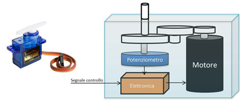 Un servomotore è un organo meccanico di potenza in grado di gestire un movimento comandato mediante un semplice segnale digitale. È generalmente costituito da un motorino DC completo di riduzione meccanica, un sistema di feedback per laposizione dell’asse d’uscita, e di tutta l’elettronica di controllo. Tramite un opportuno sistema di comando è quindi possibile far ruotare l’asse di uscita e posizionarlo in una specifica e precisa posizione.