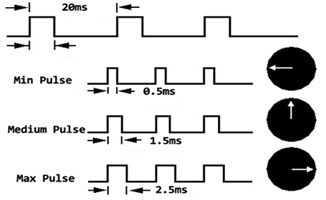 Il segnale di controllo è di tipo PCM (Pulse-Code Modulation: Modulazione a codifica di impulsi): in pratica è costituito da una serie di impulsi TTL in cui la durata del singolo impulso determina la posizione dell’asse d’uscita. La durata di un impulso può variare tra 0.5ms e 2.5ms. Il periodo tra un impulso e l’altro può variare invece tra 10ms e 40ms (oltre 40ms l’albero del servo potrebbe ritornare nella posizione di riposo).
