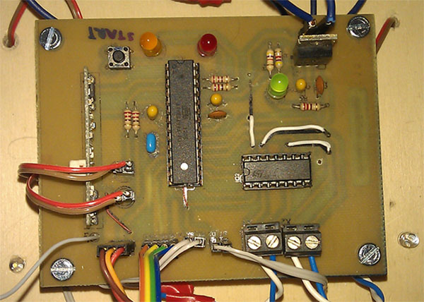 Il progettino che avevo realizzato in precedenza per l’università prevedeva l’impiego di un ATmega8535 programmato in assembly (in modo da essere forzati a studiare per bene l’architettura interna del micro). Non avendo più disponibile l'ATmega8535, ho deciso di riaggiornare il progetto ricorrendo ad un ATmega88, sistemando anche su PCB auto-costruito tutta la centralina progettata (il progetto precedente era invece su millefori).