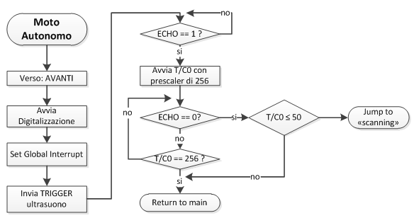 Per risalire al tempo impiegato dall’ECHO per ritornare basso, si ricorre al timer/counter 0 dell’ATmega88 che viene avviato appena l’ECHO diventa alto, e stoppato quando l’ECHO ritorna basso.