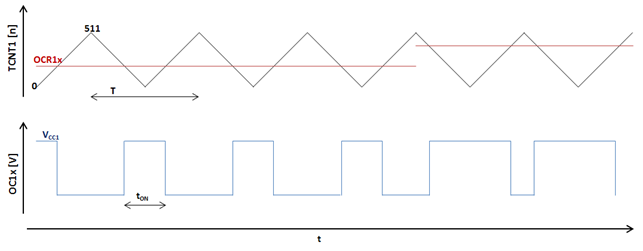 quando il valore di OCR1x è maggiore del valore di TCNT1, l’uscita del pin OC1x sarà imposta ad 1 logico. Appena il valore di OCR1x diventa inferiore al valore di TCNT1, allora l’uscita del pin OC1x sarà impostaa 0 logico.