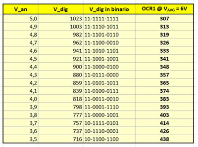 L’errore di 4 bit è più che tollerabile in quanto causa una discrepanza di Vmotor di pochi mV. A ciò aggiungiamo che pure i valori in tabella sono arrotondati (infatti, realmente sono dei floating, ma nel registro OCR1x è necessario piazzare dei valori interi).
