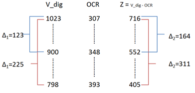 900 dista Δ=123 da 1023. Il corrispettivo valore dato dalla differenza tra Vdig e OCR (ossia Z=552) dista invece Δ2=164 da 716.